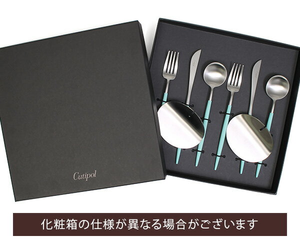カラーターコイズ 内容・デザートスプーン×2・デザートナイフ×2・デザートフォーク×2・カトラリーレスト×2 材質カトラリー/ステンレス(つや消し/マット)、樹脂カトラリーレスト/ステンレス(つや消し/マット) サイズ・スプーン/縦18cm・ナイフ/縦20cm・フォーク/縦18.5cm・カトラリーレスト/縦7cm 横9cm 高さ2cm・化粧箱/縦26cm、横26cm、高さ3.5cm ブランドCutipol(クチポール) / Portugal(ポルトガル) 生産国Portugal(ポルトガル) シリーズGOA(ゴア) デザイナーカトラリー/Jose Joaquim Ribeiro(ホセ・ホアキン・リベイロ) 化粧箱化粧箱入 箱のデザインは予期せず変更される場合があります。