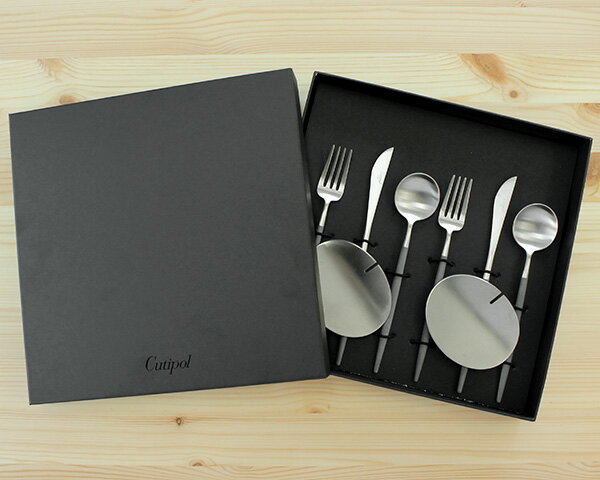 カラーグレー 内容・デザートスプーン×2・デザートナイフ×2・デザートフォーク×2・カトラリーレスト×2 材質カトラリー/ステンレス(つや消し/マット)、樹脂カトラリーレスト/ステンレス(つや消し/マット) サイズ・スプーン/縦18cm・ナイフ/縦20cm・フォーク/縦18.5cm・カトラリーレスト/縦7cm 横9cm 高さ2cm・化粧箱/縦26cm、横26cm、高さ3.5cm ブランドCutipol(クチポール) / Portugal(ポルトガル) 生産国Portugal(ポルトガル) シリーズGOA(ゴア) デザイナーJose Joaquim Ribeiro(ホセ・ホアキン・リベイロ) 化粧箱化粧箱入 箱のデザインは予期せず変更される場合があります。